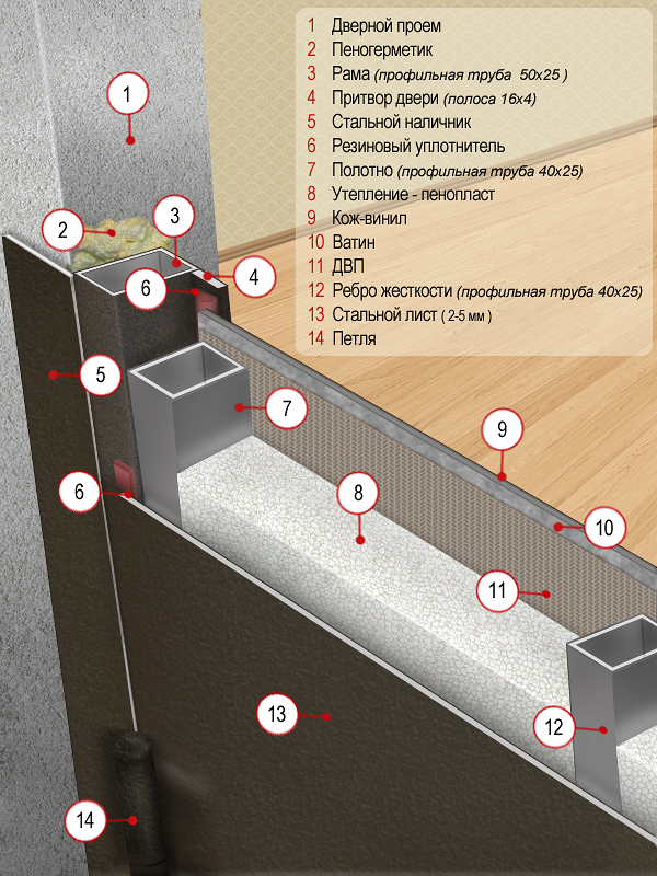 *ВНИМАНИЕ! Дверь изготавливается по фактическим размерам вашего проема, поэтому цена может отличаться от заявленной на сайте. Также вы можете изменить комплектацию на свое усмотрение. ПОМНИТЕ, мы являемся отечественным производителем, поэтому дверь изготавливается индивидуально для вас, с учетом всех ваших пожеланий и требований. ГАРАНТИЯ на наши двери составляет - 10 лет. На замки от 1 года до 3 лет, зависит от производителя замка. ДОПОЛНИТЕЛЬНЫЕ УСЛУГИ-доставка и монтаж по Казани - от 2000 руб. -демонтаж старой деревянной двери - 300 руб. -демонтаж металлической двери - 500-1000 руб. -подъем на этаж без лифта - 100 руб./этаж -расширение дверного проема от 1000 руб. -заделка швов монтажной пеной - 300 руб. -доставка за МКАД начиная с 11км - 30руб./км. КОНСТРУКЦИЯ ДВЕРИ |